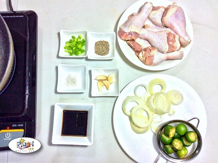 - In a large bowl, combine onions, garlic, peppercorns, Calamansi juice and soy sauce, then add the chicken and mix well.