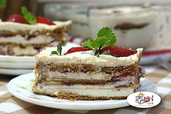 - Place another layer of graham crackers, followed by vanilla cream and arrange another slices of strawberries and repeat process for the last time, ending with a cream.